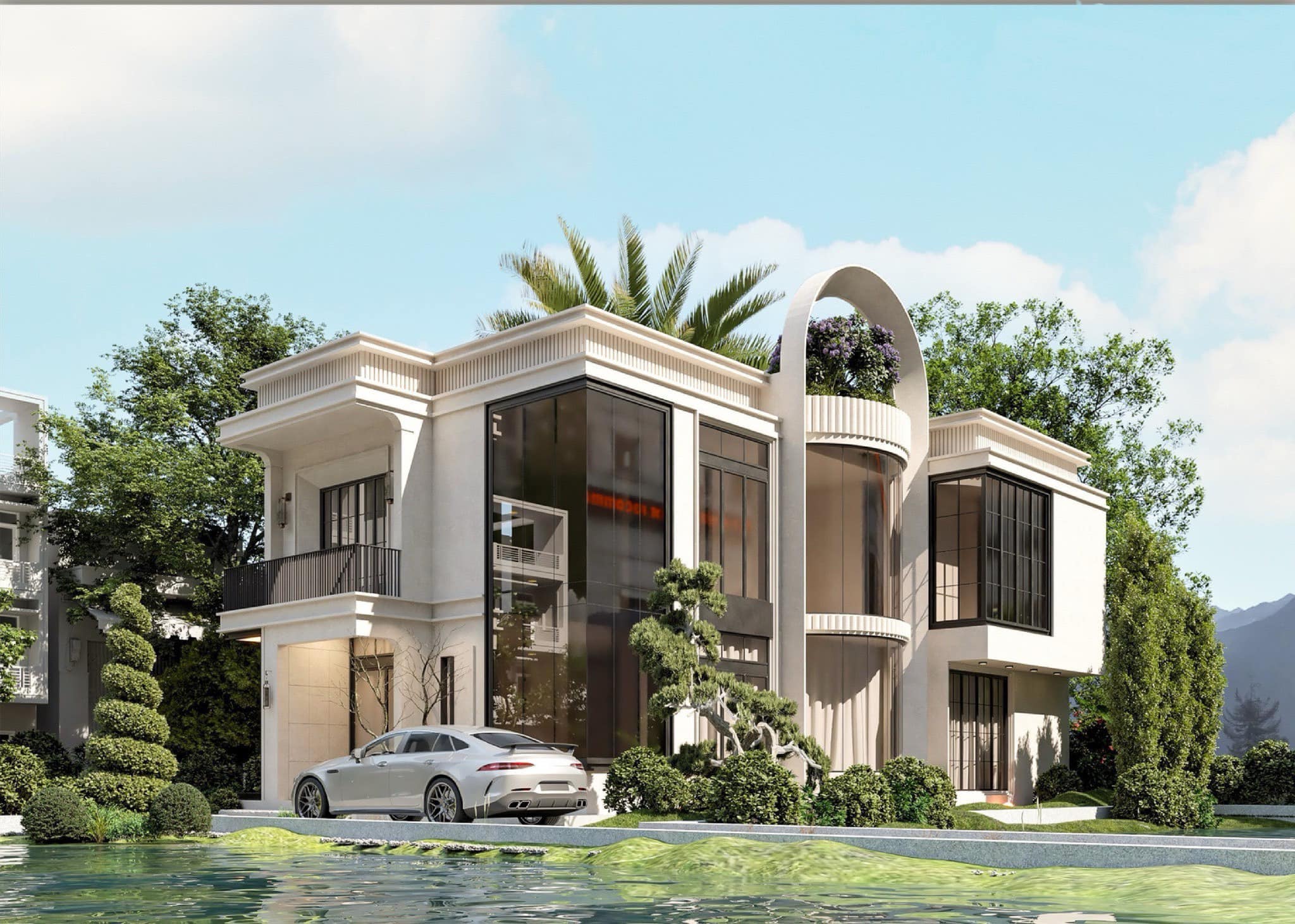 Căn nhà có phong cách hiện đại, nhưng độc đáo với sự kết hợp hài hoà giữa những hình khối vuông vức kèm vòm cong tạo điểm nhấn. Hệ cây xanh ở khu vực sân và mặt hồ trước nhà giúp cho không gian được thông thoáng, mát mẻ.