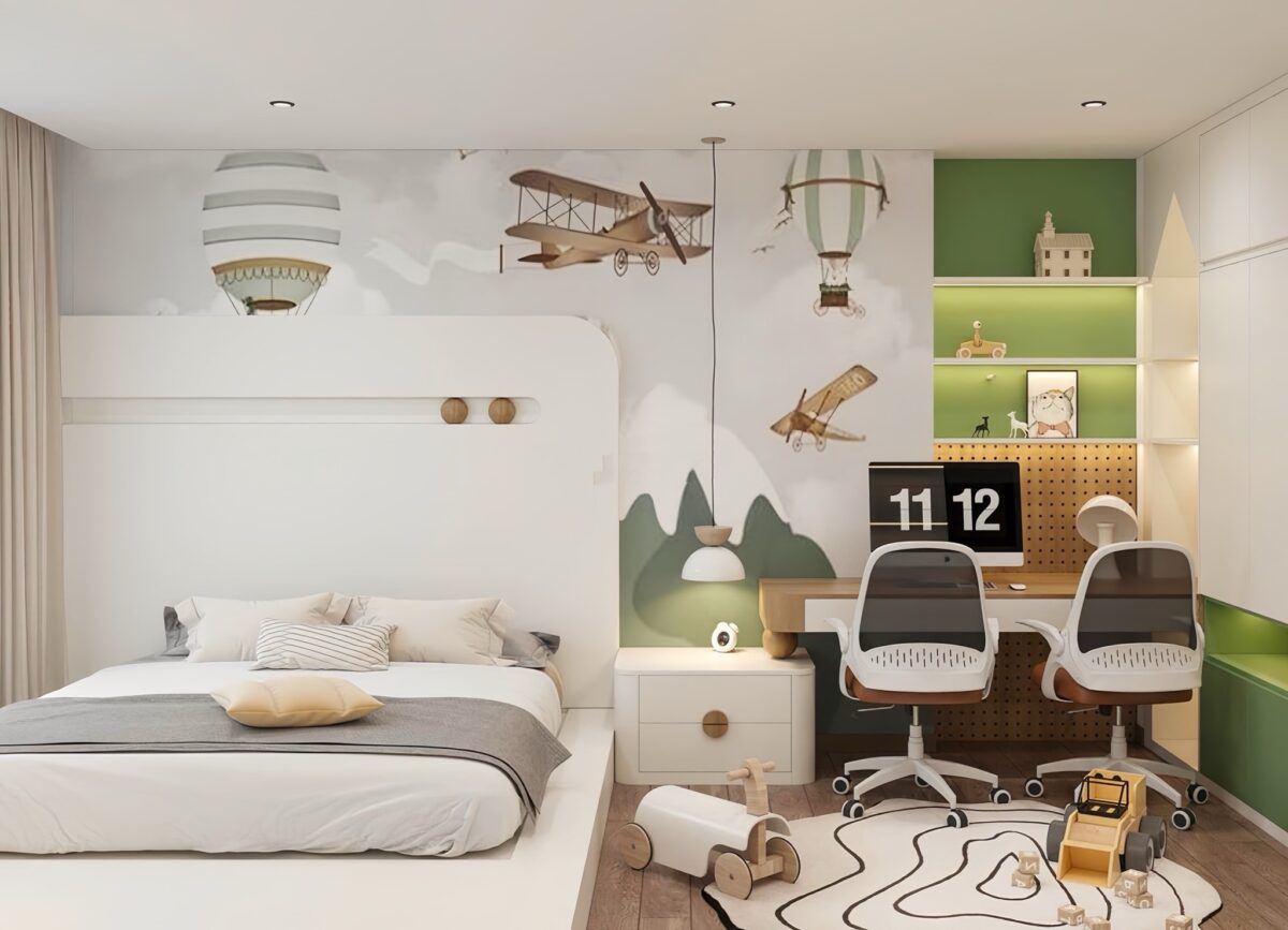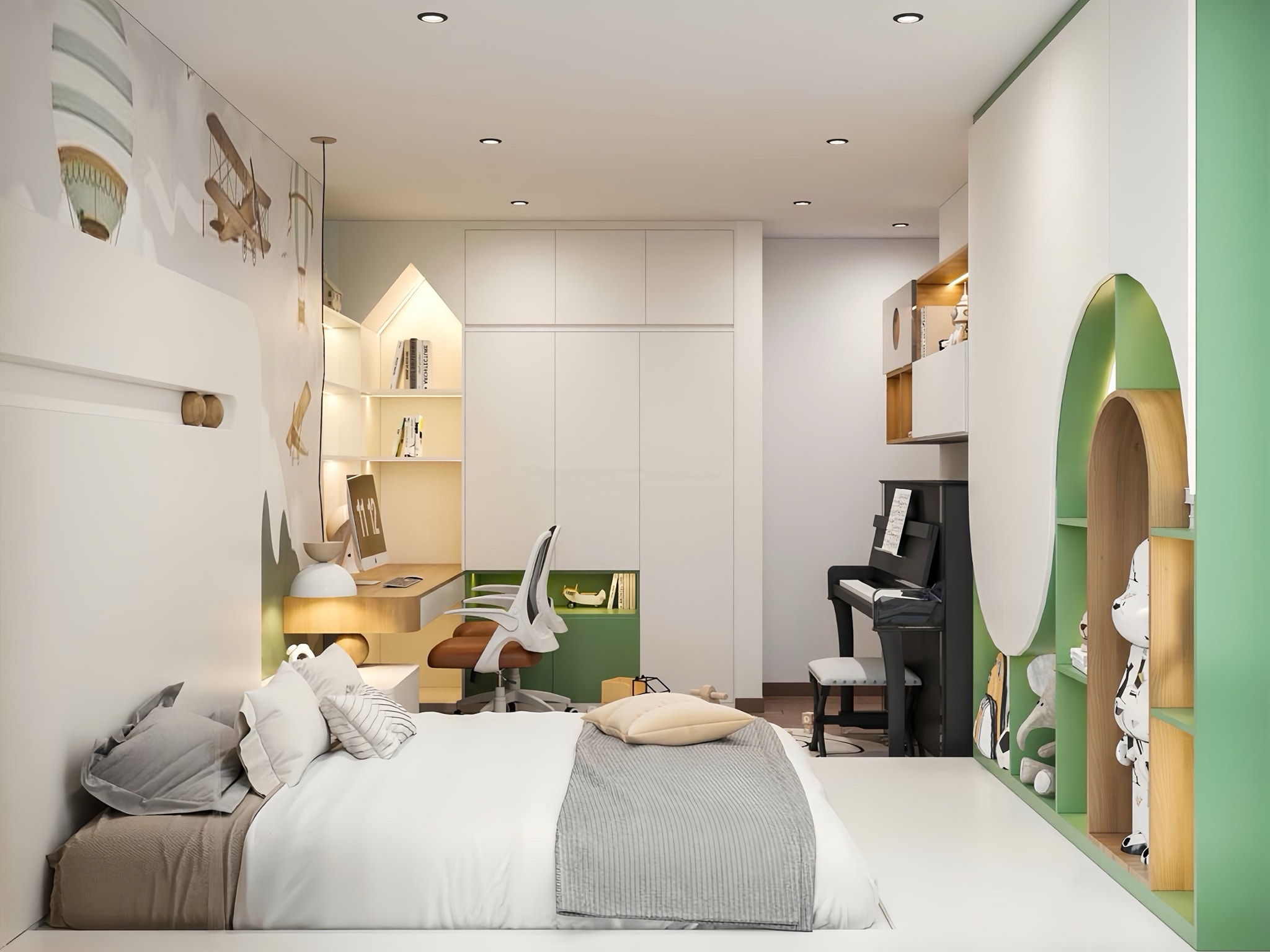 Con vừa có không gian nghỉ ngơi vừa có không gian học tập, giải trí, luyện tập piano. Không những thế tận dụng những kệ tủ treo, tủ đứng cuối giường để làm góc decor những món đồ yêu thích của con sẽ tạo không gian sống đầy cảm hứng cho bé