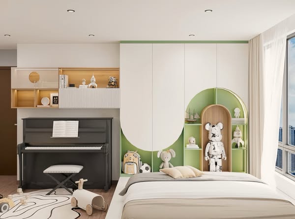 Con vừa có không gian nghỉ ngơi vừa có không gian học tập, giải trí, luyện tập piano. Không những thế tận dụng những kệ tủ treo, tủ đứng cuối giường để làm góc decor những món đồ yêu thích của con sẽ tạo không gian sống đầy cảm hứng cho bé